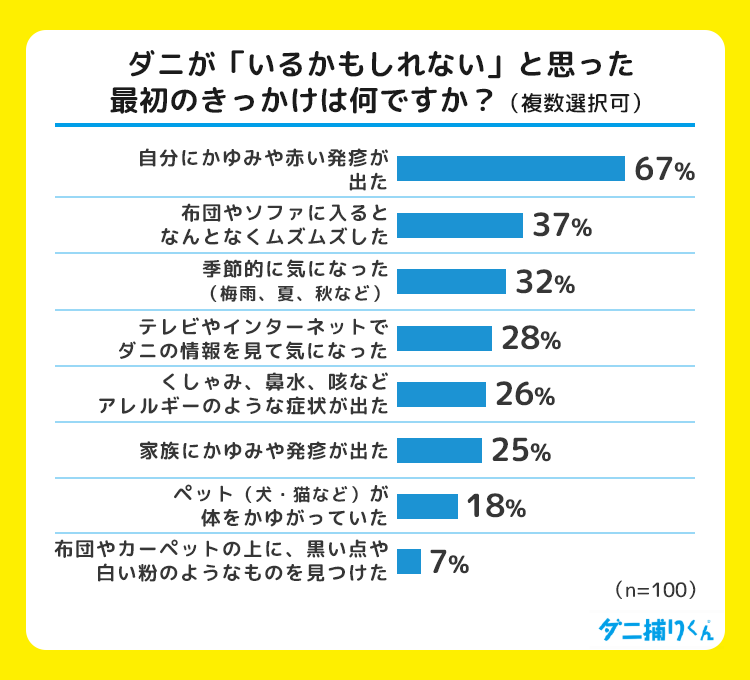 また実施した独自調査でも、ダニの存在を疑う最初のきっかけとして最も多かったのは 「自分にかゆみや赤い発疹が出た」(67%) となっています。