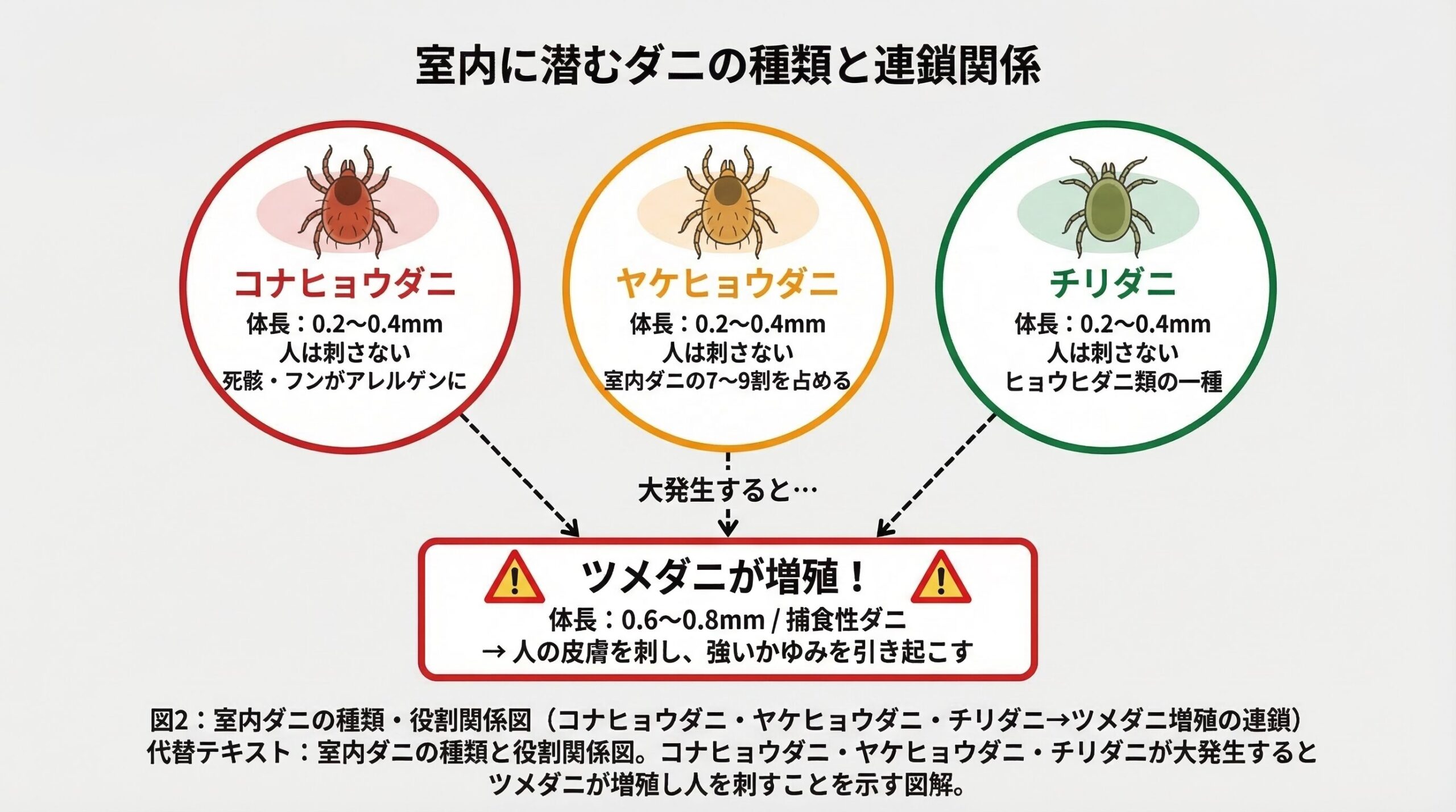特に注意したいのがツメダニの増殖サイクルです。コナヒョウダニやヤケヒョウダニが大発生すると、それらを餌とするツメダニも連動して増えます。つまり「ヒョウヒダニ類を減らすこと」が、刺咬被害を防ぐ近道になります。
