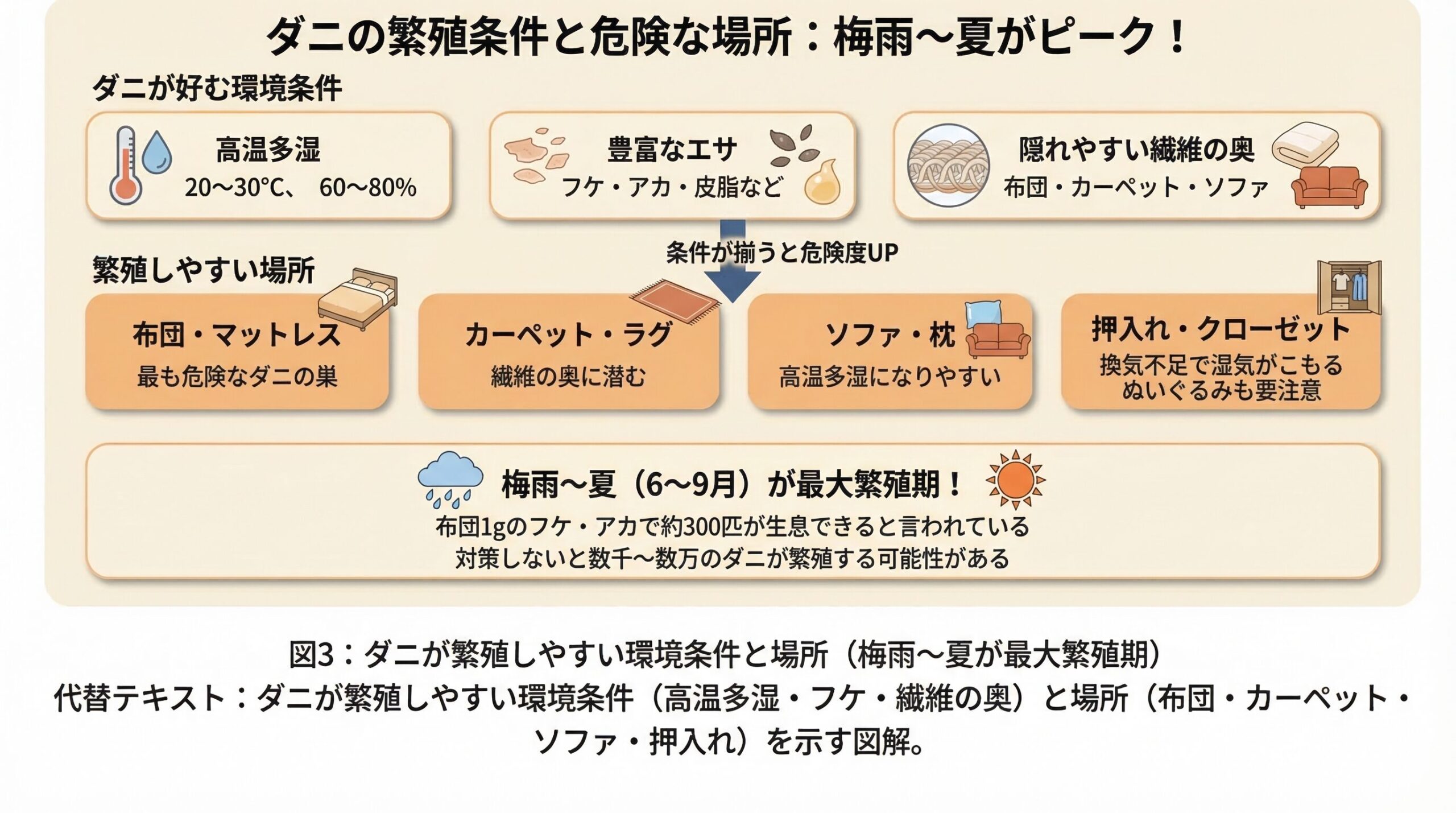 布団やマットレスは「ダニの楽園」です。体温で温まり、寝汗を吸い、フケやアカが溜まる布団は、ダニにとって最高の生息地です。特に梅雨から夏にかけては集中的な対策が必要です。
