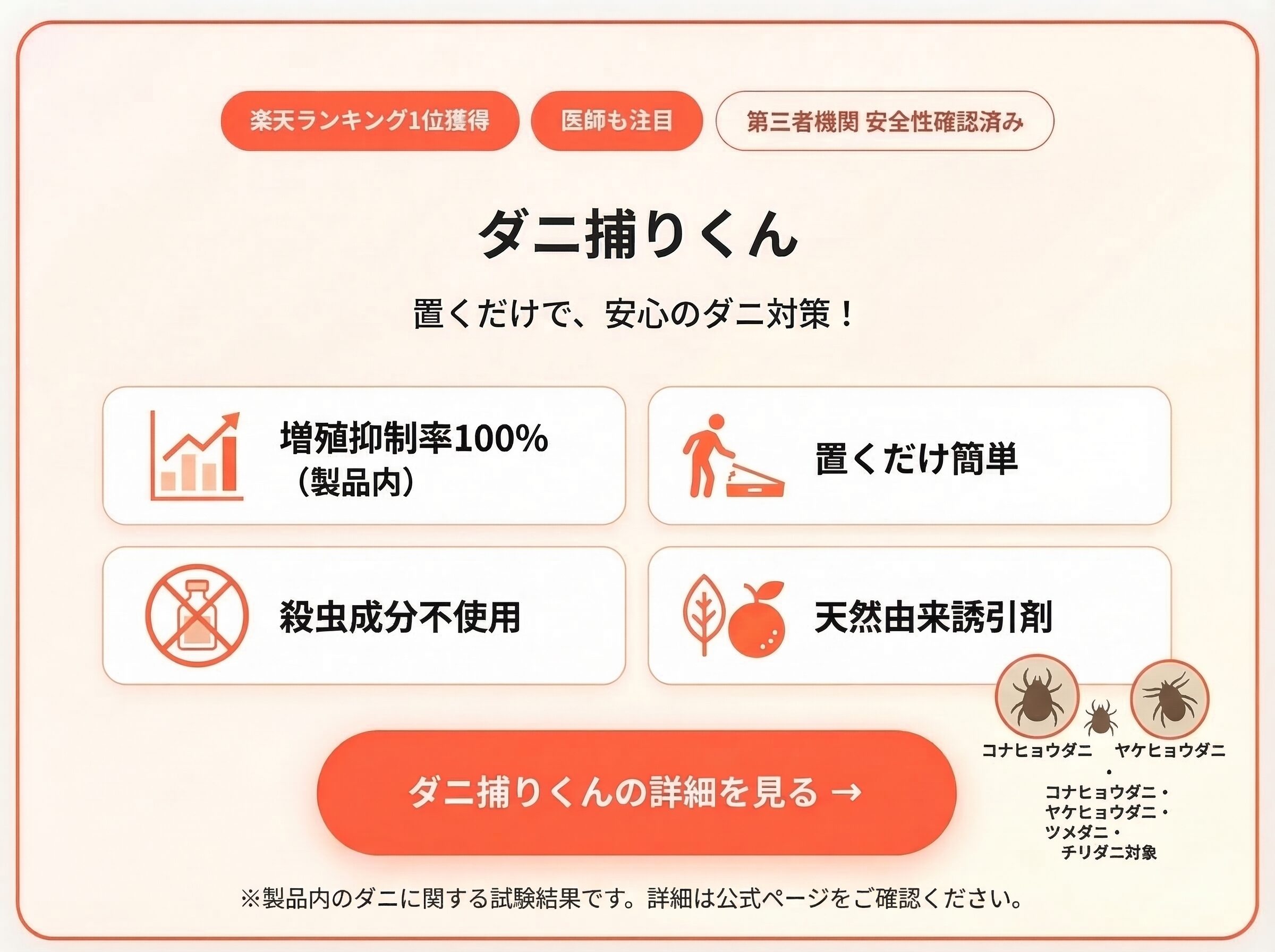 - 根本対策は「高温乾燥・換気・掃除・ダニ捕りシートの継続使用」の組み合わせ