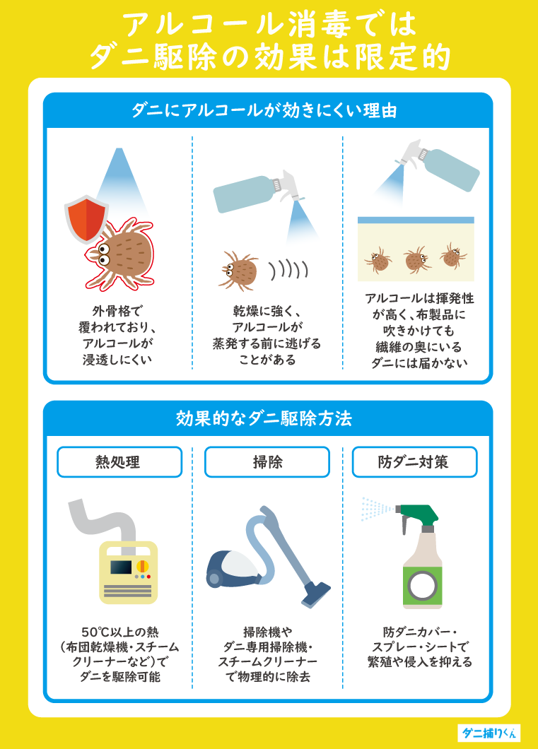 ただし、アルコールの殺菌効果によりダニの餌となるカビを予防できるため、間接的な効果は期待できます。