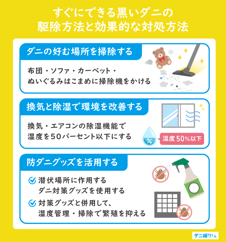 すぐにできる黒いダニの駆除方法と効果的な対処方法は、以下の通りです。