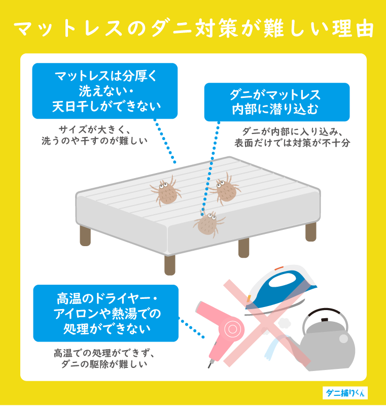 このように、マットレスの構造と住環境の条件が重なることで、日常的なダニ対策が思うように進まないケースが多いのです。